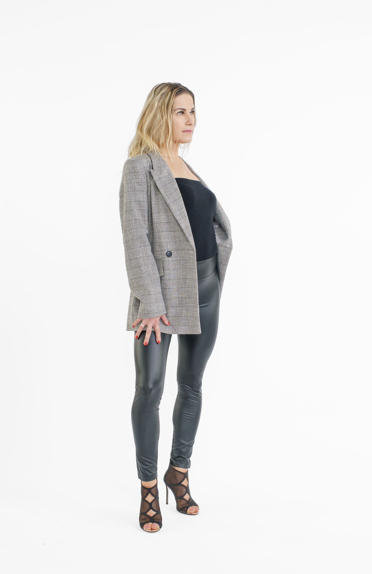 Toppi sopii hyvin jakun alle ja ilman jakkua olet valmis tanssilattialle. Jakku, nahkahousut ja kengät rekvisiittaa.
