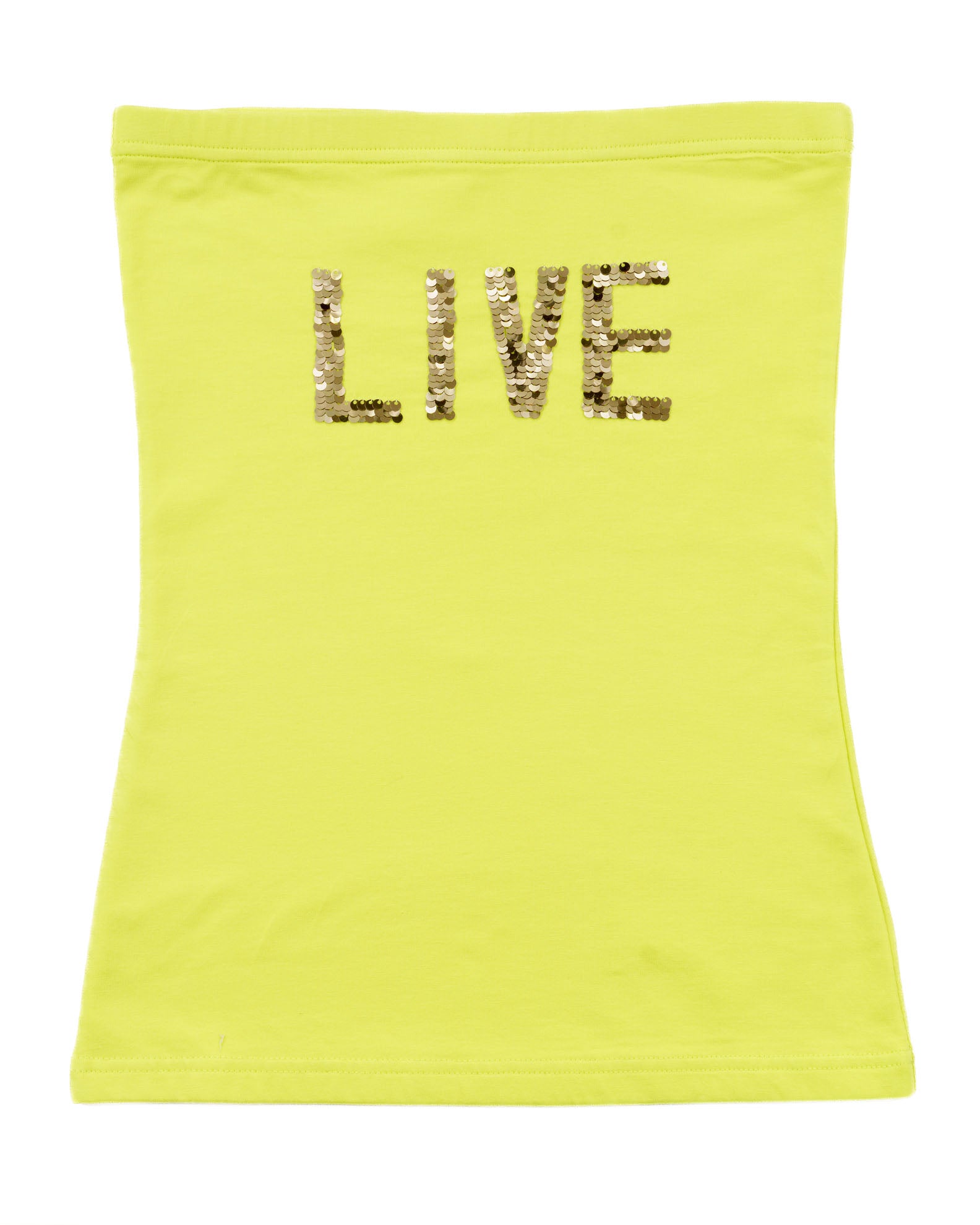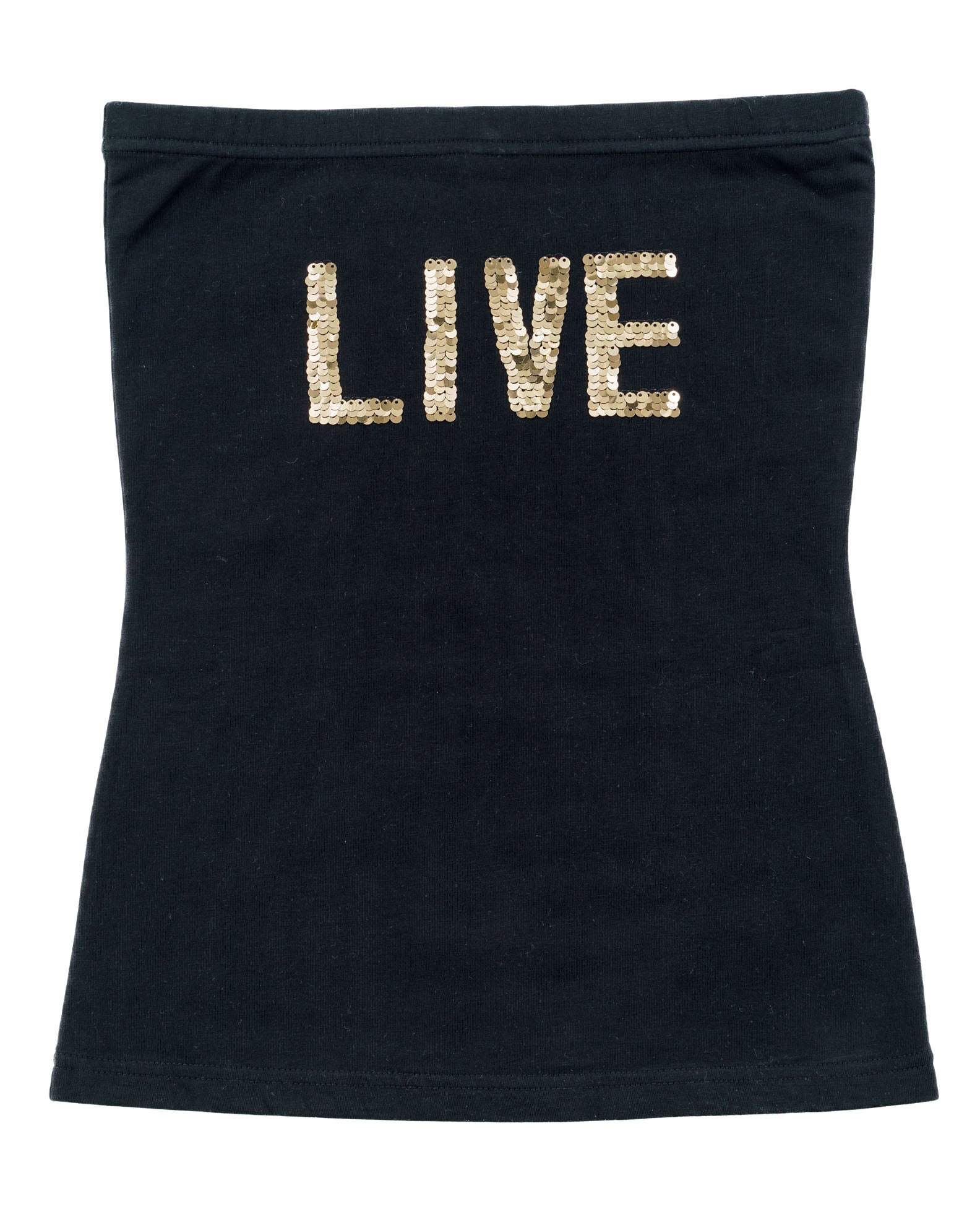 Härlig topp i ekologisk bomull. Paljetterna är vändbara, så du kan använda texten i antingen guld eller silver. Framsidan av toppen är gjord av duppelt tyg.